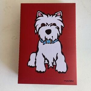 Set includes cosmetic bag, luggage tag, and passport/ cardholder all with Marc tetro’s trademark westie images.