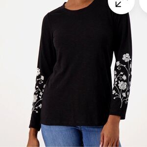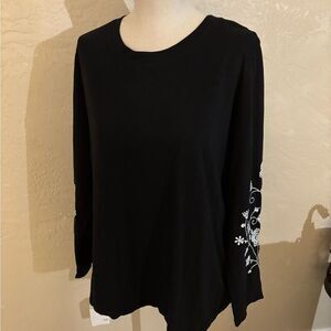 Elegant black top with intricate floral embroidery on the sleeves. Perfect for adding a touch of sophistication to any outfit.