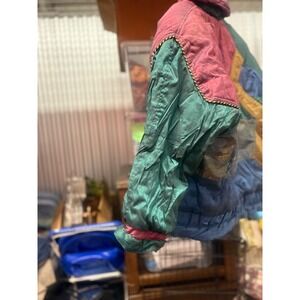 Keywords: vintage jacket, bomber jacket, patchwork, quilted, metallic, teal, pink, gold, statement jacket, retro fashion, unique outerwear, bold style, 80s fashion, 90s fashion, colorful jacketew photos as they are part of description