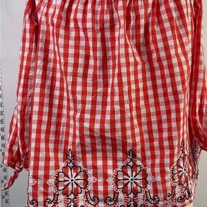 Crown & Ivy Red Checkered Blouse with Black Embroidery