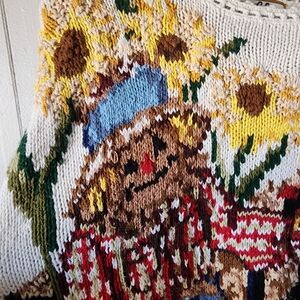 Features: Handcrafted 3D details, pumpkins, barn, sunflowers, textured knit, long sleeves, crew neckline