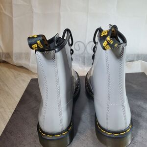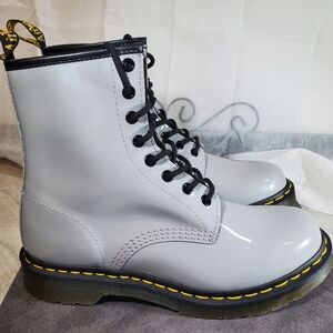 Step out in style with these Womens 1460 Dr. Martens Zinc Grey High Grain Patent Leather 8" Shaft Boots. Perfect for adding a bold touch to any outfit.