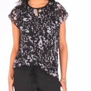 CABI Chirp top features light blue bird pattern on navy background. Fully lined, with chunky exposed rear zipper. Polyester. Machine wash. NEW. Approx 21" armpit to armpit, 25" shoulder seam to hem.