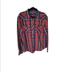 This colorful plaid western style long sleeved shirt by Ben Sherman is in great pre-loved condition, and a size 3XL. It’s 100% cotton plaid in maroon, orange, navy, and white, and features snap closure and double chest pockets with snap closures. Measurements are as follows: