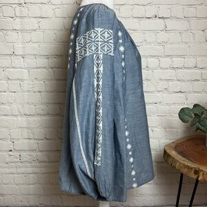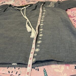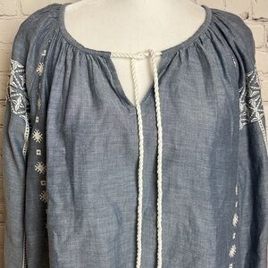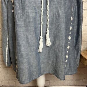 If blue and white is your preferred palette, you'll love the Peasant Top. This 100% cotton top features a blue background and white embroidery detailing. Long white cords with tassels accentuate the neckline. The styling options are endless with such a versatile, classic piece.