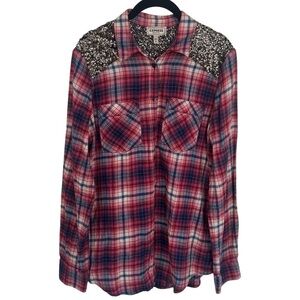 Express Boyfriend Red and Blue Sparkle Panel Plaid Long Sleeve Button Up Size M