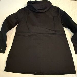 Classic black utility jacket by Hunter. Features a hood and button closure. Ideal for versatile styling. New with tags.. water resistant