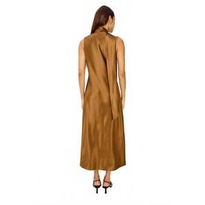 Introducing the Lorenza Midi Dress by Rails, a stunning choice for your next evening event. This sleeveless dress in a solid ginger hue features a V-neckline and a bias-cut A-line silhouette, designed for both elegance and comfort. Crafted from luxuriously silky fabric, it has a lustrous sheen and an attached self-tie scarf for added sophistication. Closure: Pull on. Care: Hand wash and line dry. Perfectly embodying the quiet luxury trend, this dress is a must-have for the spring season.