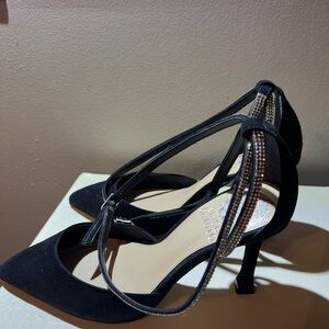 This is a Vince Camuto Women's Ketrinda Ankle Strap Pump in size 6.5. The pump is black in color and features a rhinestone design strap with buckle closure. It is a stylish and elegant heel.