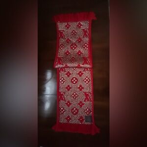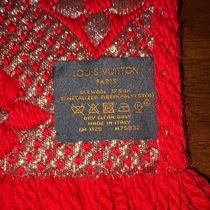 Louis Vuitton Logomania Shine scarf in red with a silver metallic monogram knit. The scarf features the iconic LV monogram pattern woven into a blend of wool and silk, with metallic fibers to create a shimmering effect.