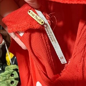 Free people romper. Orangish color with white polka dots. One small flaw as depicted in photo.
