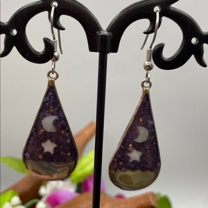 Stunning vintage MOP and abalone inlay with a celestial design and silver tone findings Alpaca Mexico hook earrings just over a 2 inch dangle.