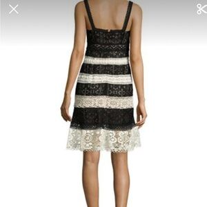 Experience the elegance of Nanette Lepore's black lace dress featuring intricate floral patterns and a sophisticated scalloped edge trim. This luxurious piece combines modern design with classic elements, offering a high-quality addition to your collection.