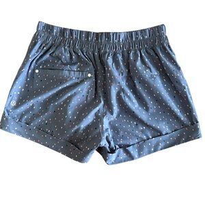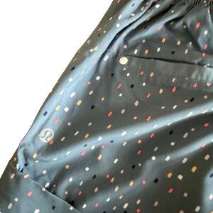 These Lululemon Athletica shorts offer a relaxed fit with a stylish speckled blue design, perfect for athletic activities. The elastic waistband and white drawstring ensure a customizable fit, while the lightweight fabric provides breathability and comfort for any workout.