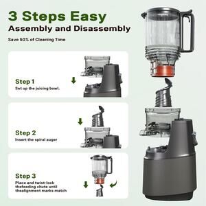The Masticating Juicer by Atsent is a cold press juicer with a large 5.3" feed chute, making it easy to juice a variety of fruits and vegetables. With a sleek metal gray color and a durable design of ABS, stainless steel, and silicone, this juicer is both stylish and efficient. It includes 34oz and 24oz juice cups, as well as a brush and pusher for easy cleaning and operation. With a wattage of 250.0, this juicer is perfect for home use and offers convenient assembly instructions for effortless setup.