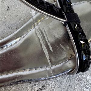 Check out the pictures. These are not missing any stones, but as you see from the picture, the silver on the foot bed has peeled in the creases. Otherwise, they are in good condition.