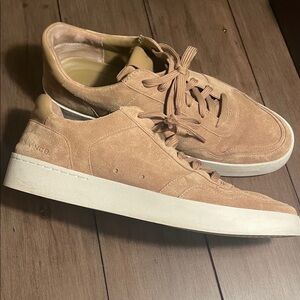 Vince men's sneakers in light brown suede. Sleek and stylish design. Comfortable for everyday wear.