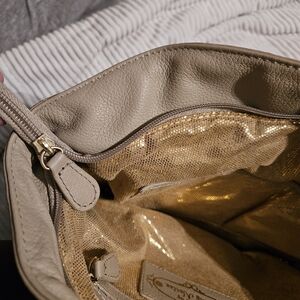 This stylish tan tote bag features elegant studded details and a chic tassel accent. Perfect for any occasion, it combines fashion with functionality. Gold sparkly interior. Beautiful bag