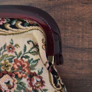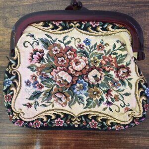 Vintage Floral Needlepoint Clutch Purse With Maroon Frame & Kiss Lock Closure