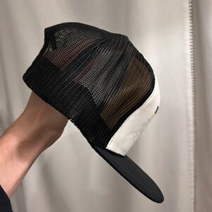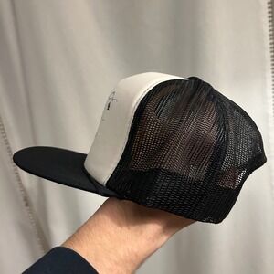 Vintage trucker hat commemorating The Cat snowmobile and Baum Shelter in McCall Idaho. Features a graphic of a snowmobile rider in a snowy mountain landscape. This hat is perfect for outdoor enthusiasts and fans of vintage sportswear. Ideal for a casual day out, a snowmobiling trip, or as a unique souvenir.