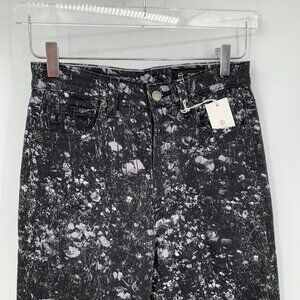 High rise button fly stretch cotton denim jeans in black, gray and white floral splatter pattern