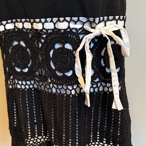 Black tank dress with crocheted detail at the bottom. A white ribbon sets off the style with a white under skirt measures 37 inches from shoulder to hemline.