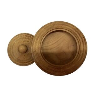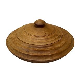 This handcrafted lidded bowl is a wonderful addition to any collector of bowls, German made items, or unique wall hangings. The bowl lid doesn't fit quite right, but in the right hands, I'm sure it could be fixed. This has a sawtooth hanger attached to its back for hanging on the wall. Roughly 8" round.