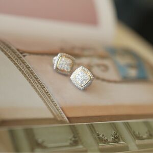 Add a chic touch to your look with these two-tone square stud earrings. Featuring a stylish blend of silver and gold, they are perfect for any occasion.