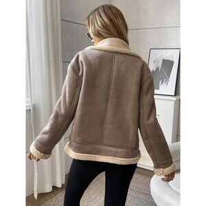Women's Faux Leather Jacket Patchwork Fur Coat Moto Zipper Sherpa Shacket Brown