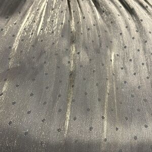 NWT Gorgeous metallic sheen dot dress. Sleeveless halter neck with center back keyhole. Smocked elastic waist. Tiered skirt. Fully lined. Size L Color Pewter 20” PTP, 15” waist & 35” L Polyester