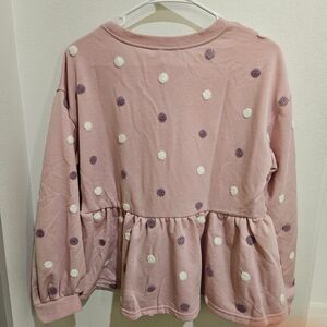 NWOT, SKU H036. See picture 3 for a very small spot. Elevate your casual wardrobe with this charming pink sweater featuring delightful textured polka dots in white and lavender. The gathered waist creates a flattering silhouette while the soft fabric ensures all-day comfort. Perfect for coffee dates, casual office days, or weekend brunches. The playful dot pattern adds a whimsical touch to any outfit, making it an versatile piece that transitions seamlessly from day to evening wear.