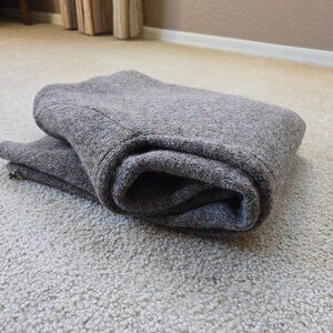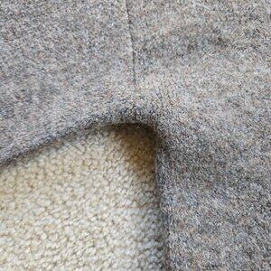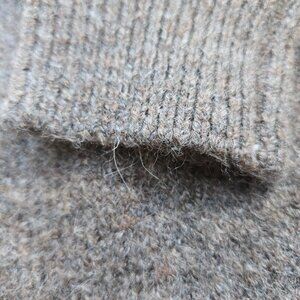 Absolutely flawless--in new condition. 95% cashmere/5% lycra. This super thick hoodie is "One Size". Please refer to the measurements to see if it would be a good fit for you. The color is a mottled brown/grey. The close up photos are just to show detail, and not pointing out any flaws. No holes, no stains, no pilling, no pet hair, no odor.