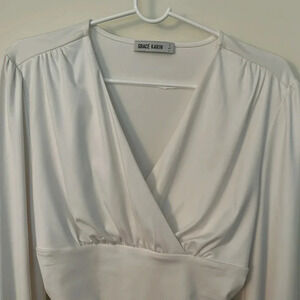 White long sleeve blouse long sleeved, criss cross vneck, ruching on the sides size large 😍