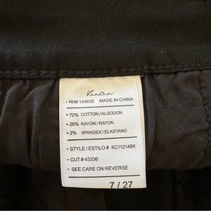 -Zip fly with button closure. 5 pockets style. Belt loops. 70% Cotton, 28% Rayon, 2% Spandex. Please see photo.