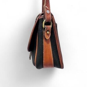Navy blue and brown leather shoulder bag.