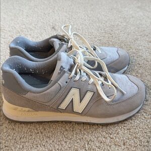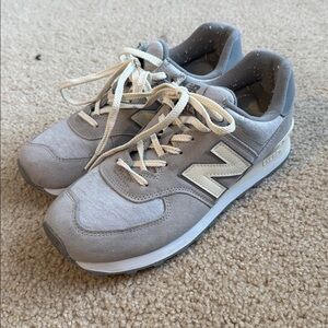 These New Balance 574 sneakers in the Grey Beige colorway are in excellent condition, worn only once. The suede and mesh upper shows no signs of wear, and the ENCAP midsole cushioning remains fully supportive. Cream laces, off-white “N” logo, and tonal grey accents give these a versatile, understated look that pairs easily with jeans, chinos, or joggers.