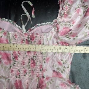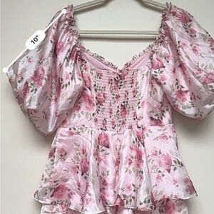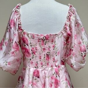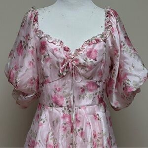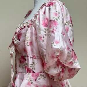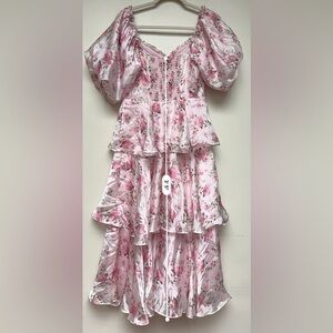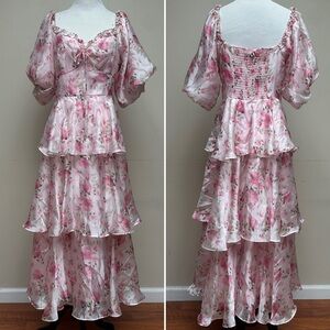 Keywords: Lulus, floral tiered midi dress, pink puff sleeve dress, romantic dress, ruffle hem dress, cottagecore fashion, feminine pink dress, size medium