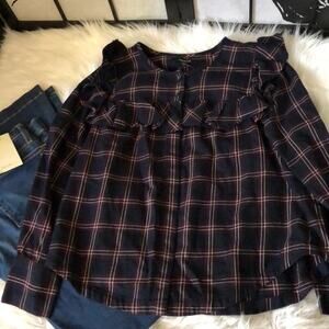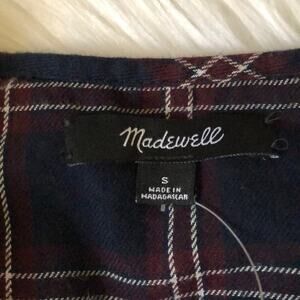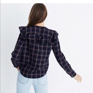Brand new Madewell Plaid Ruffle Yoke Top Size Small. Long sleeve button front closure with ruffles squares around the front. 2 button closure on the sleeve. A pop-on plaid top with a ruffled neckline and easy-to-roll sleeves. A just-add-jeans favorite in the making. True to size. BERKSHIRE PLAID DEEP NAV. Measurements: top of shoulder to hem 23”, armpit to armpit 19.5”, top of sleeve to cuff 23”