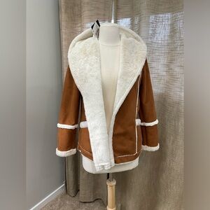 Stay cozy and stylish with this chic brown and white faux shearling jacket. Perfect for layering, this jacket offers both warmth and fashion-forward design. Size S, new