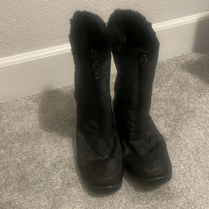 Preowned size 10 black snowboots. Chromatics by Totes. exterior is a weatherproof rain repellent material and interior is faux fur. They’re so cozy. Front zipper for easy on and off. Little wear on soles. Clean and great condition.
