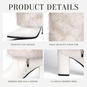 Women's White 3.3-inch Chunky Mid Calf Furry Fuzzy Fluffy Pointed Toe Boots