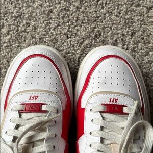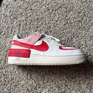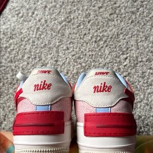 Red, blue, and cream Nike AF1 shoe. Women size 8.5. Lightly worn. Light creasing on the toe box (see last photo). Shoes kept in closet with stuffing. No box!