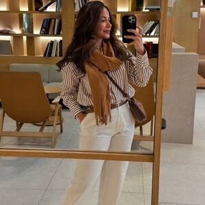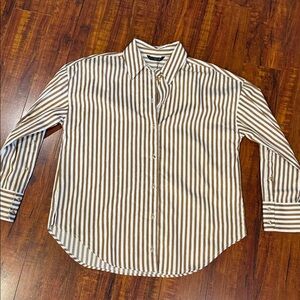 Zara White & Brown Striped Metallic Trim Button Up Cotton Blend Blouse