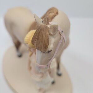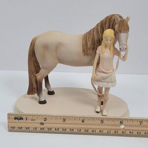 A charming resin figurine showcasing a young girl alongside a horse, with intricate details and a serene theme. Ideal for collectors or decor.
