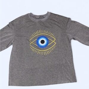 Women’s stylish gray crew neck sweatshirt featuring a blue graphic eye design in blue and gold.
