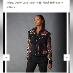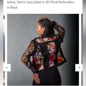 Chic black jean jacket with colorful floral embroidery. Sheer sleeves add elegance. Perfect for stylish layering.