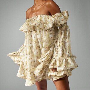 Yellow Boho Women's Chiffon Off Shoulder Floral Ruffle Bell Sleeve Mini Dress