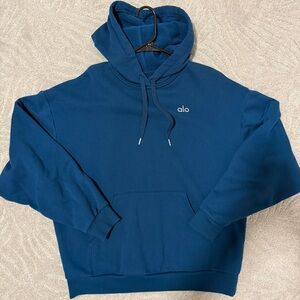 Cozy blue hoodie with front pocket. Features drawstring hood. Perfect for casual wear.