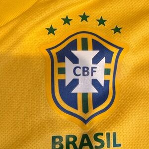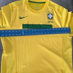 Bright yellow Nike soccer shirt. Green stripe and Brazil emblem. Dri-FIT material.