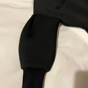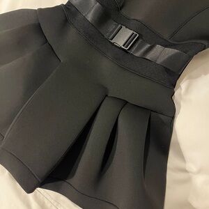 Kids black scuba fabric dress with attached belt. Pleating details on bottom.